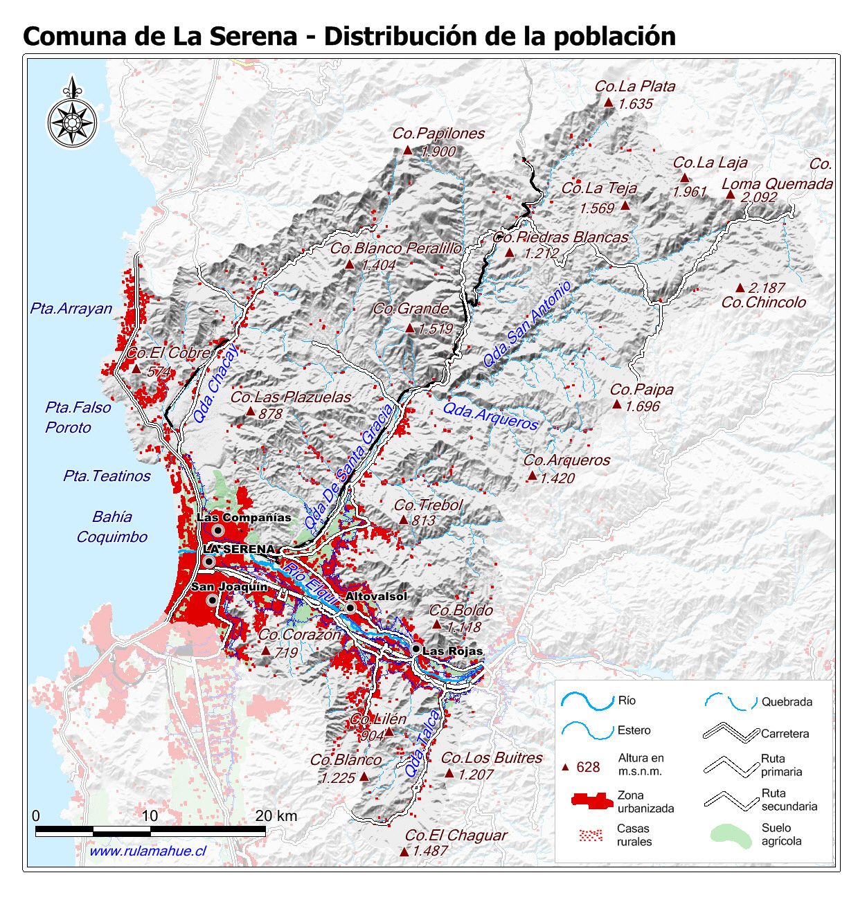 Mapa que muestra la ubicación y expansión de las zonas urbanas y la distribución de las casas rurales.