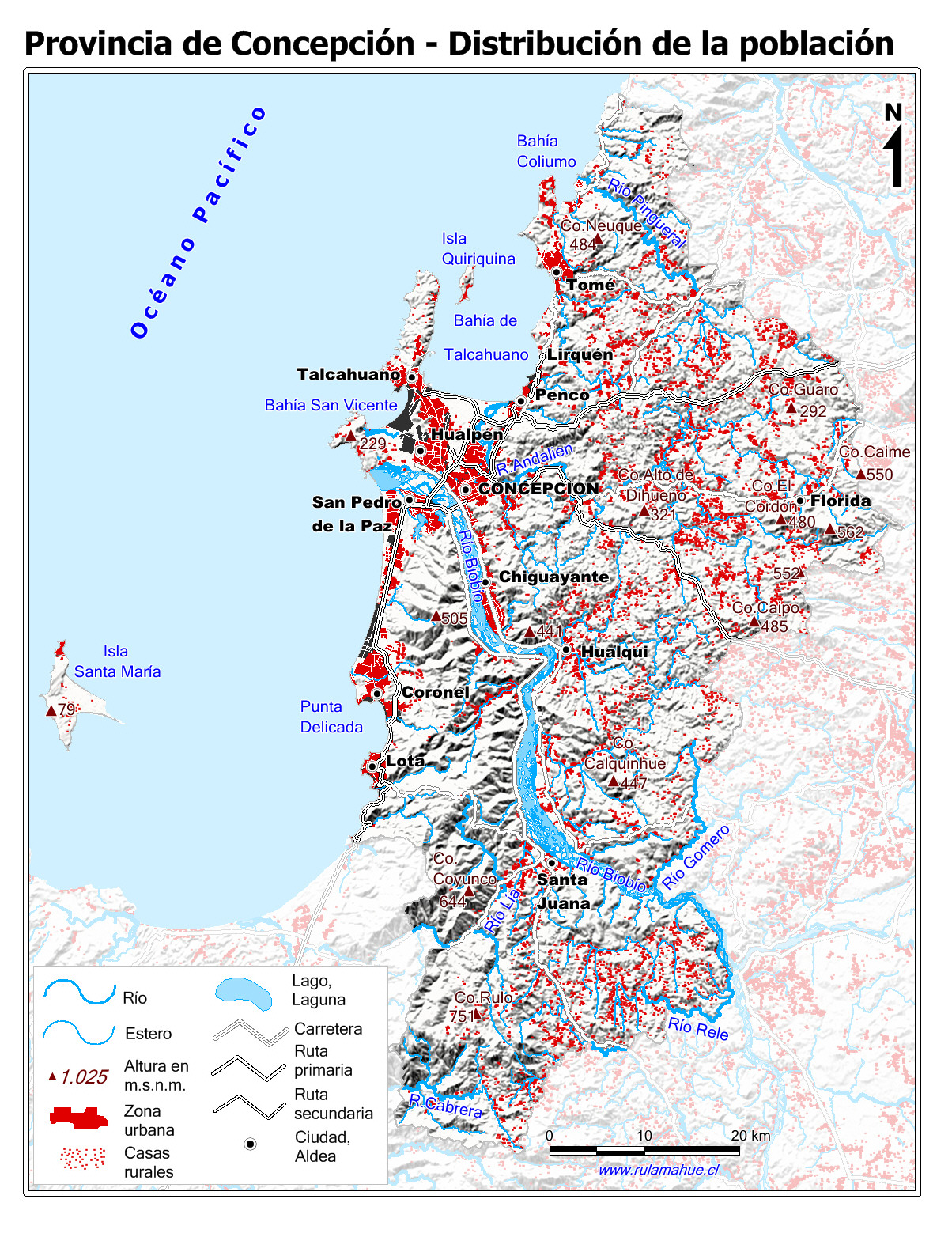 Mapa que muestra la ubicación de las zonas urbanas y la distribución de las casas rurales.