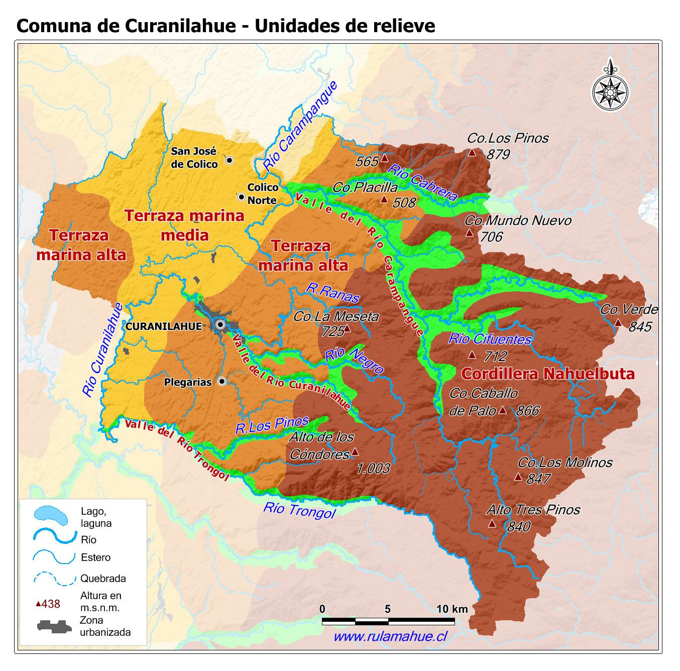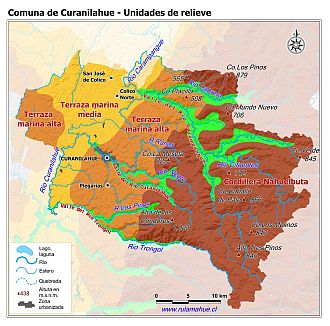 Mapa de las unidades del relieve de la comuna con información adaptada de Marcos S. Moreno S. (2004): Dinámica del antearco externo en la zona del bloque de Arauco, 37º-38ºS, Octava Región, Chile..