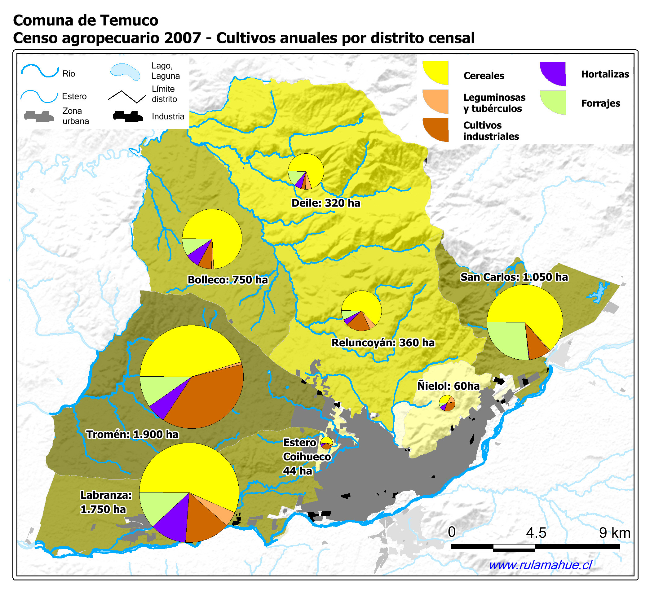 Los diferentes tipos de cultivos anuales por distrito censal de acuerdo información proporcionada por ODEPA.