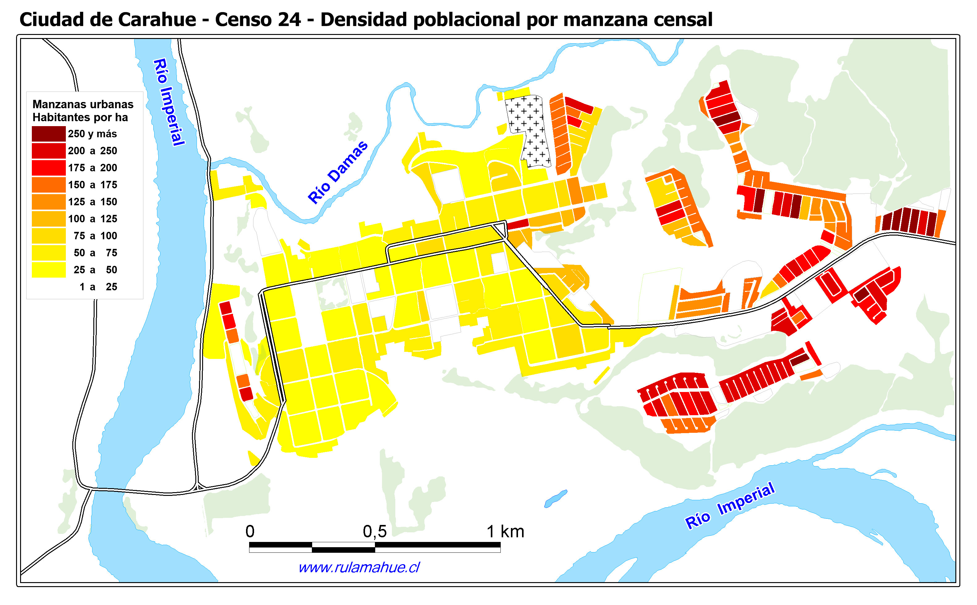 Ciudad de Carahue, Densidad poblacional por manzana censal.
