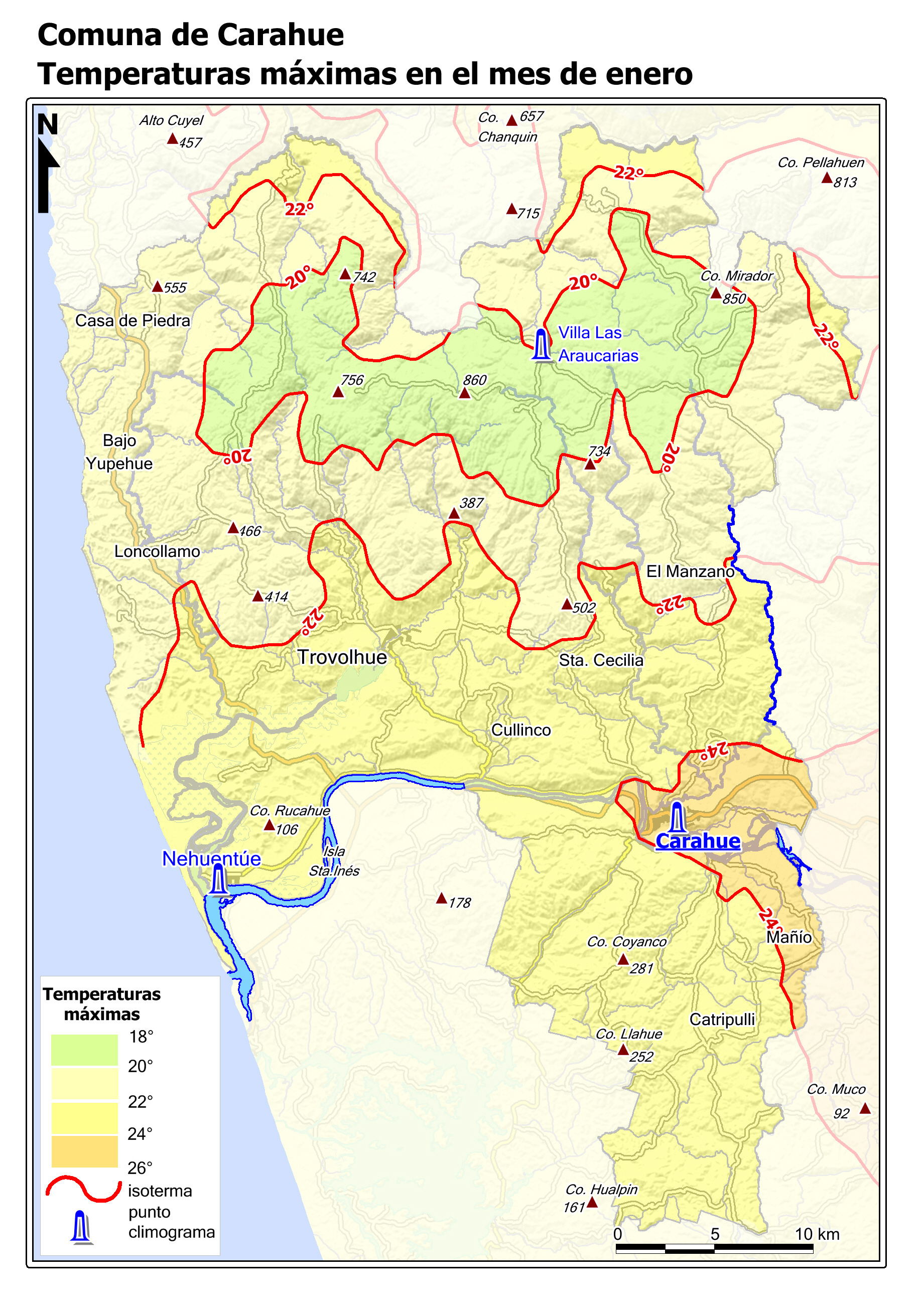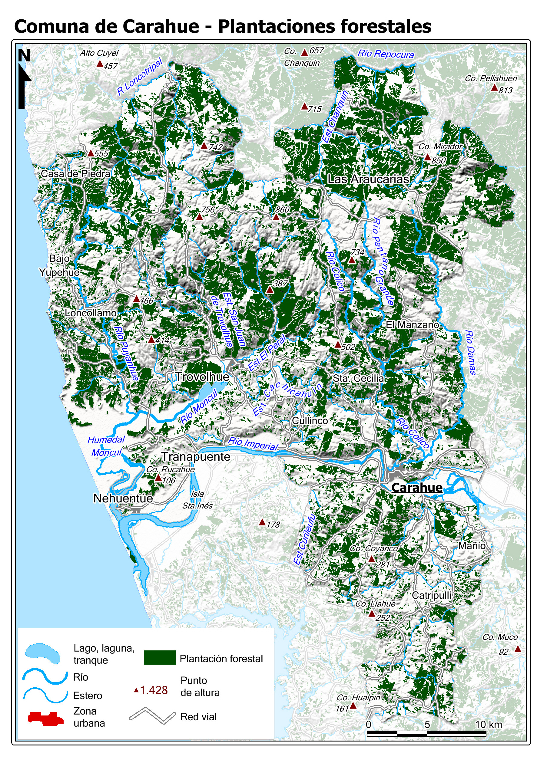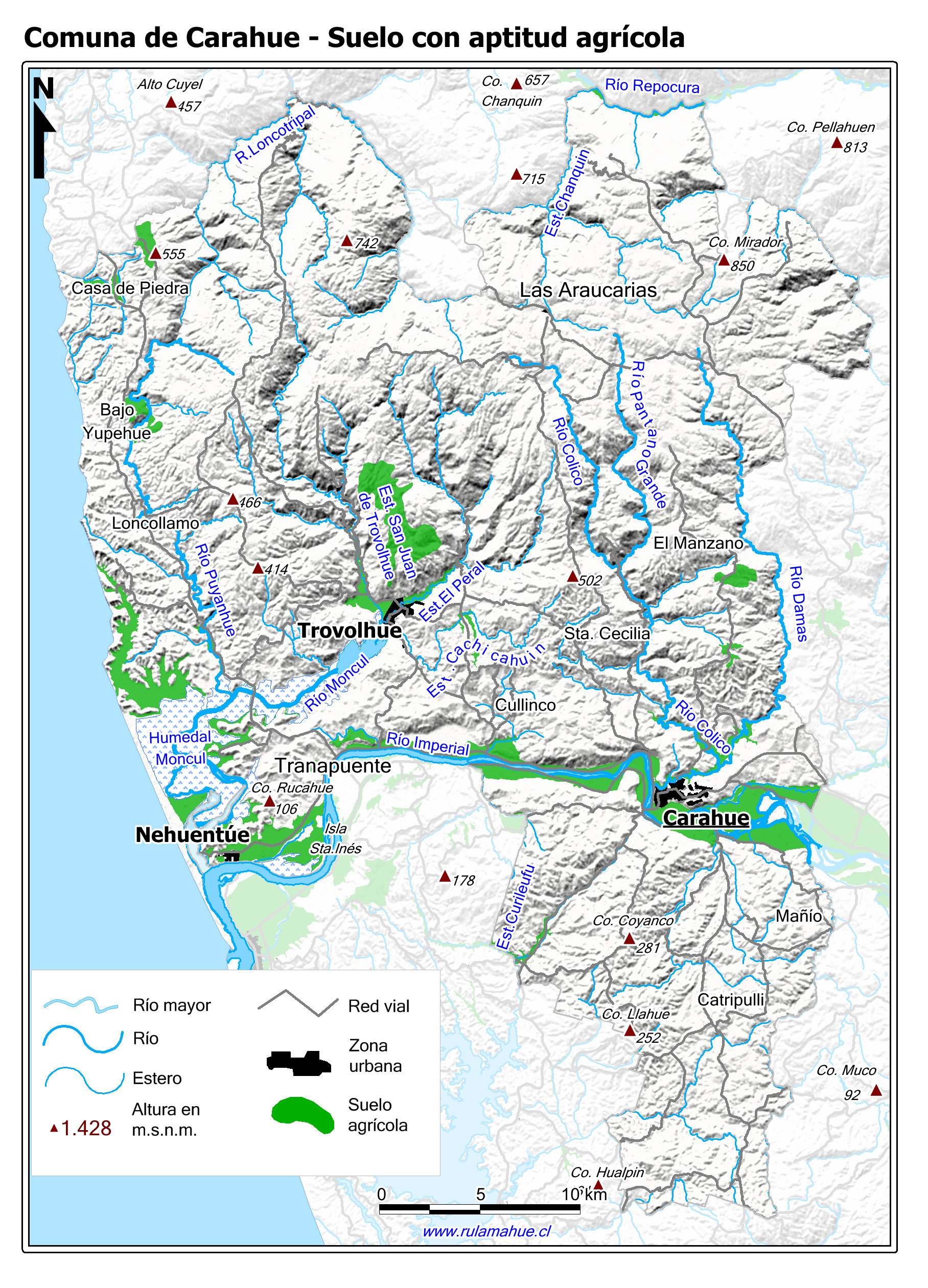 Mapa base de la Comuna con fondo de niveles de alturas coloreadas.