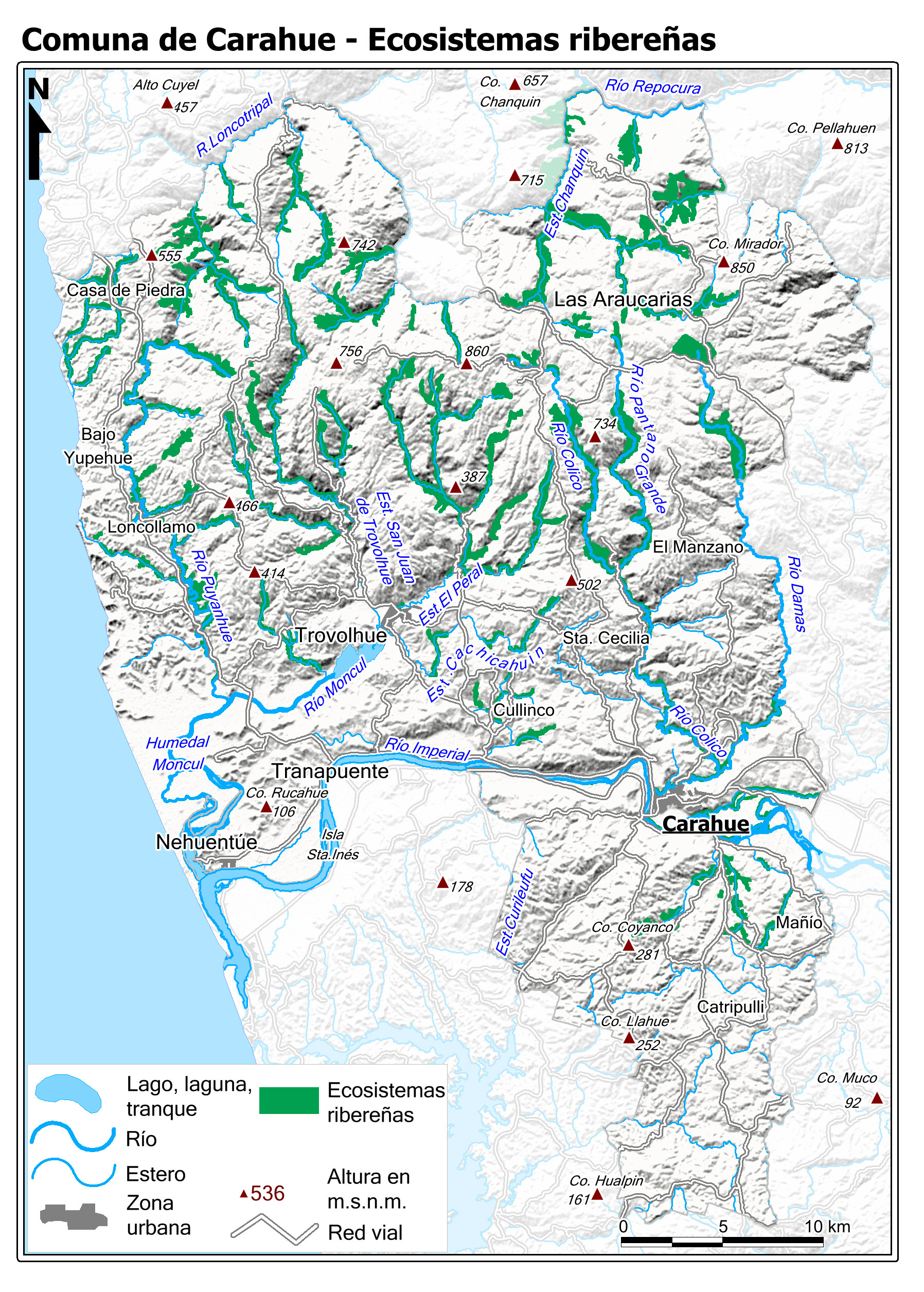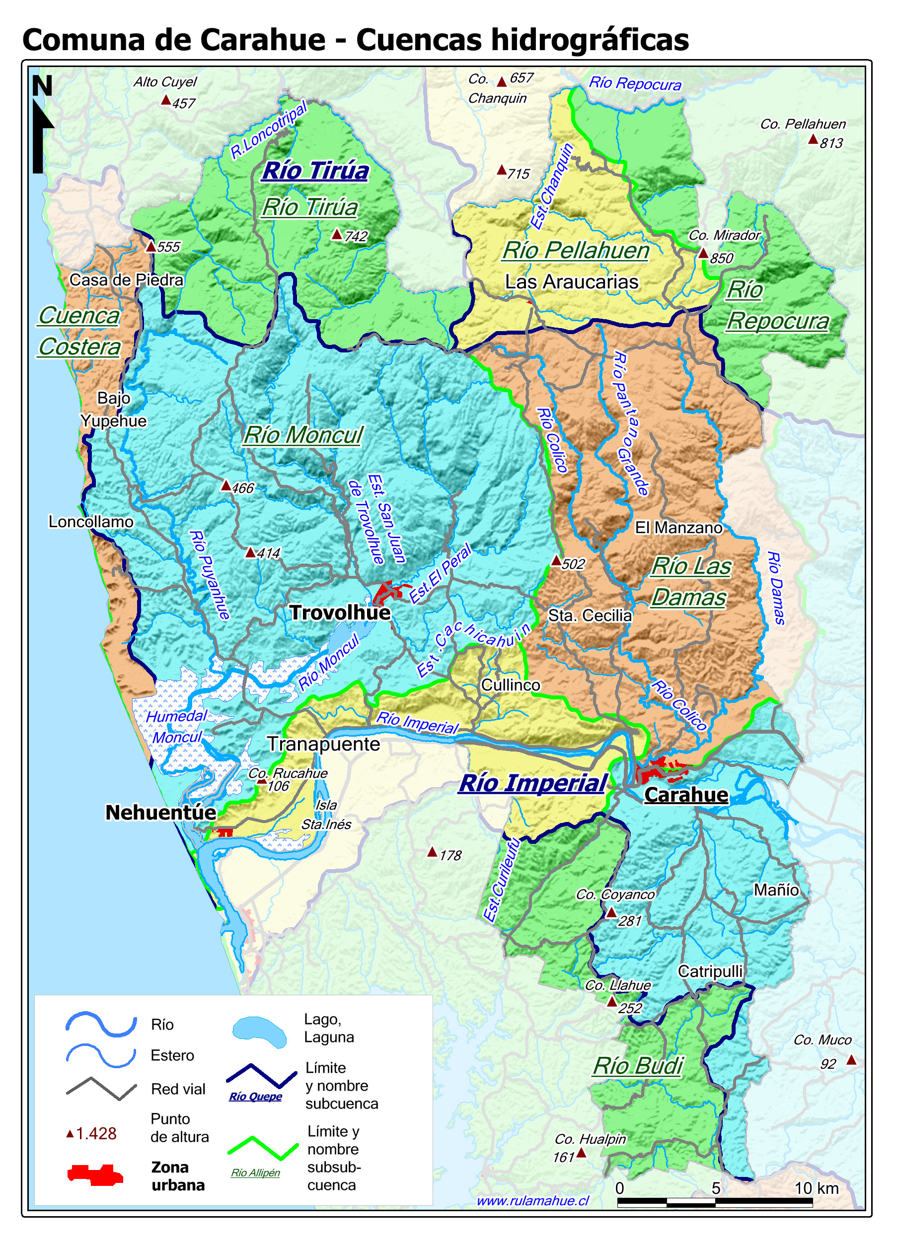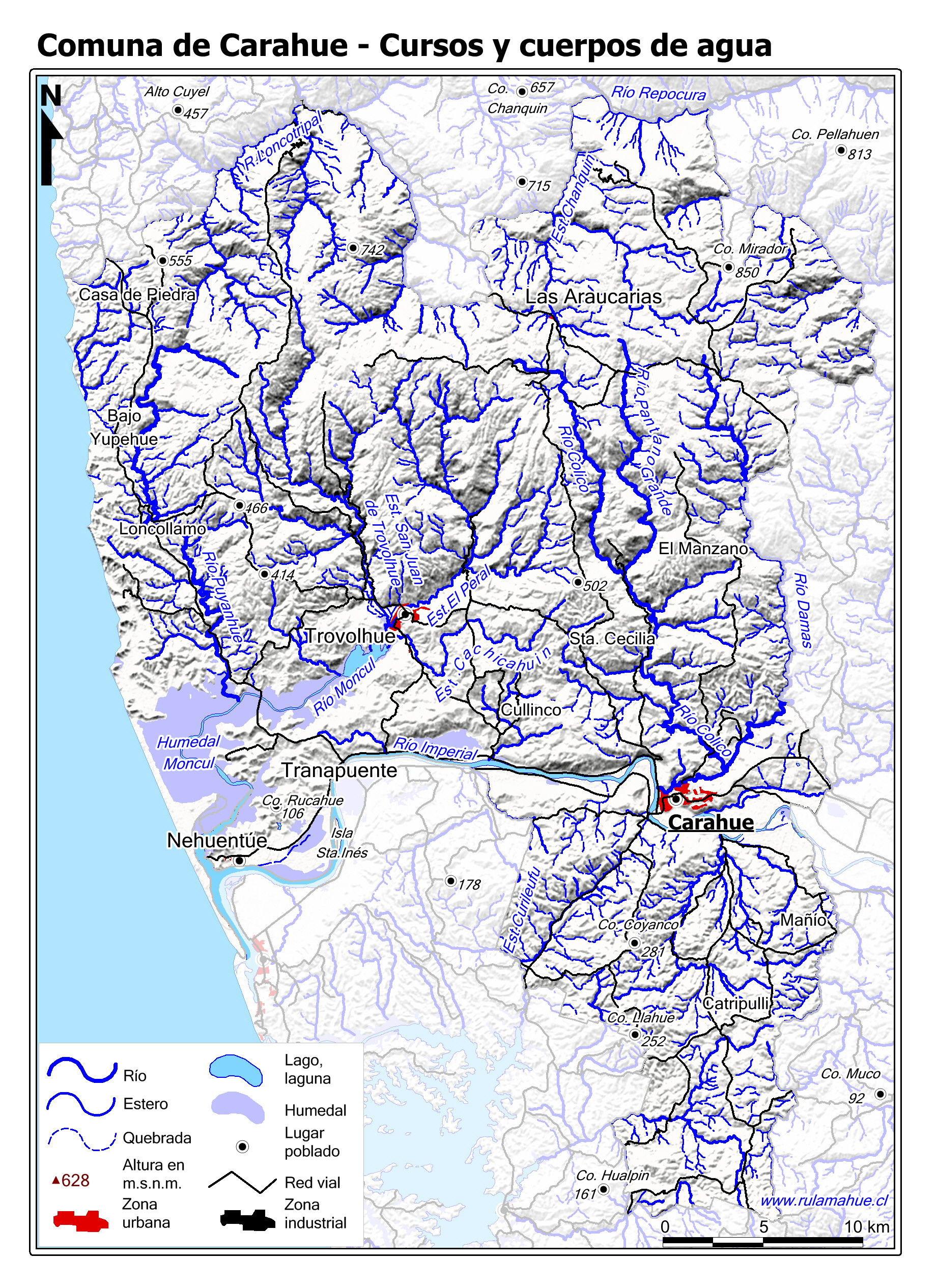 Mapa base de la Comuna con fondo de niveles de alturas coloreadas.