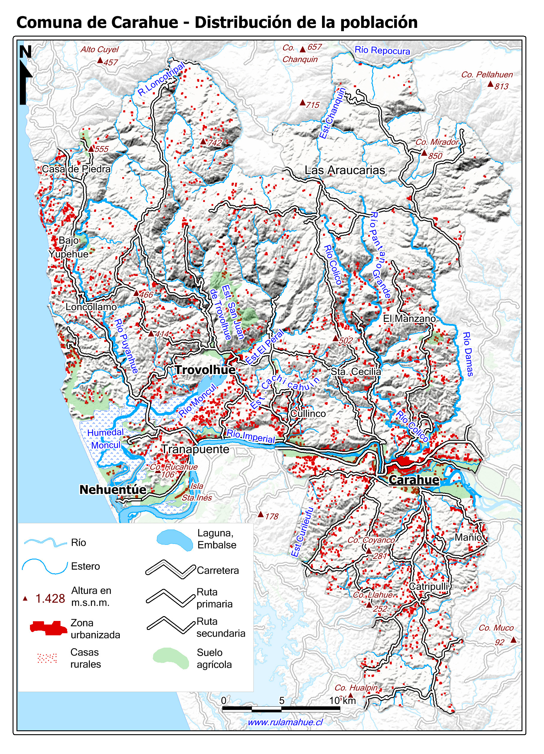 Mapa que muestra la ubicación y dimensión de las zonas urbanas y la distribución de las casas rurales.