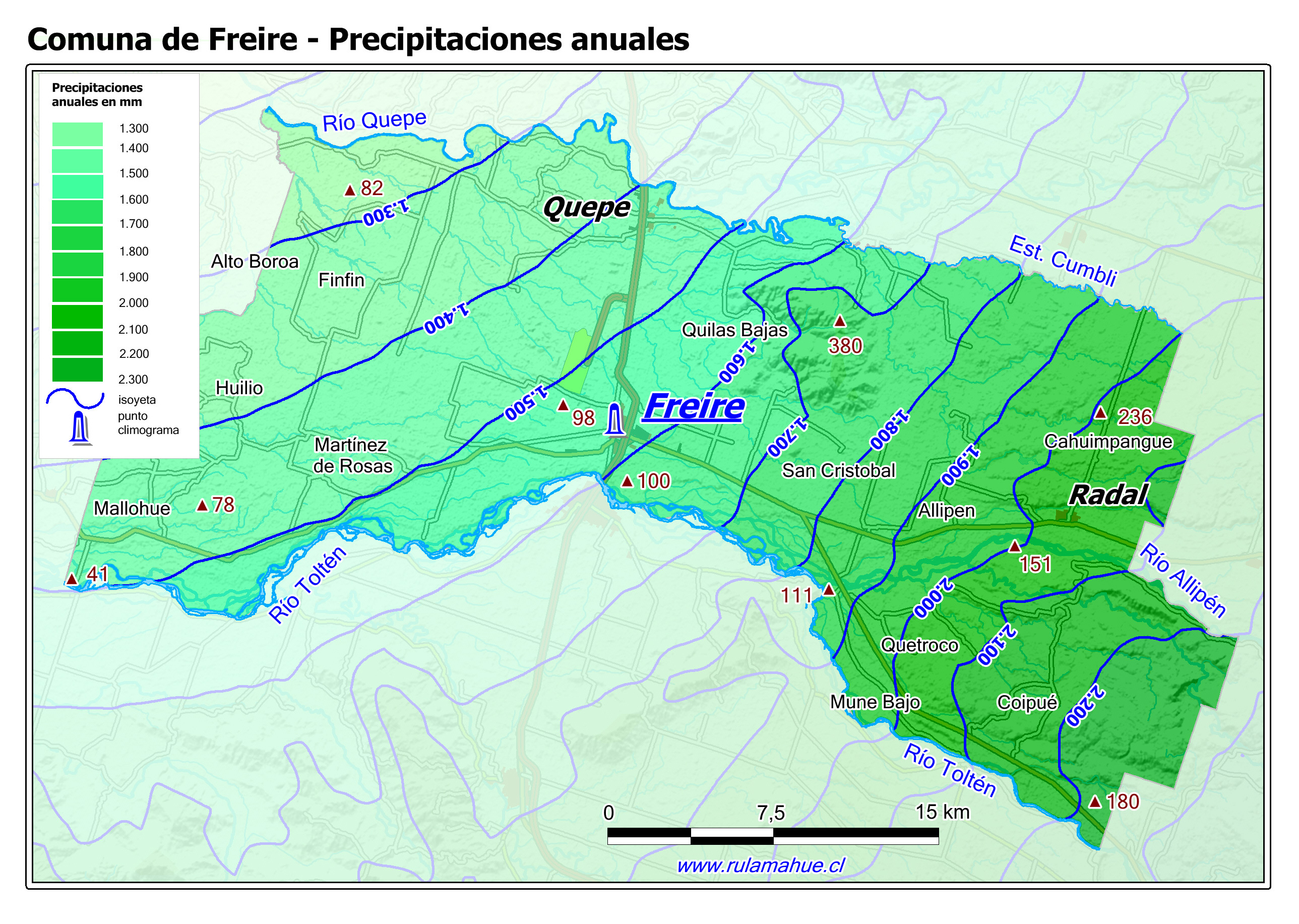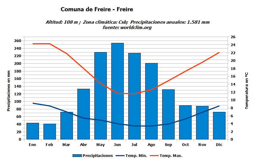 Climograma de Freire en la comuna de Freire con datos del sitio web Worldclim.