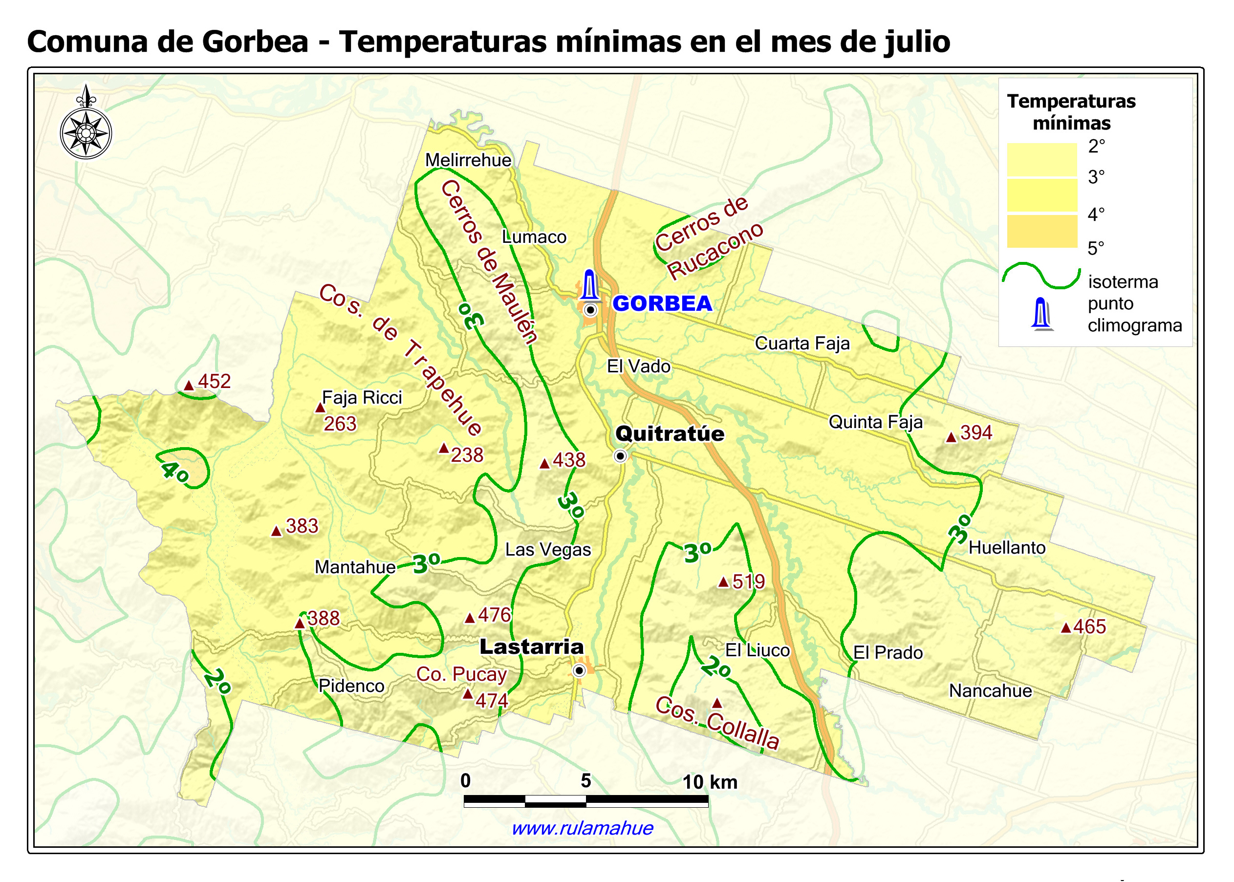 Mapa de la distribución de las temperaturas mínimas de julio con datos del sitio web Worldclim.