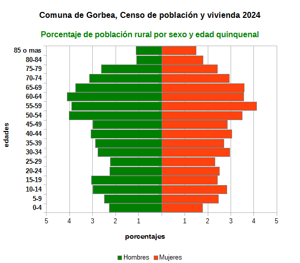 Gráfico con los porcentajes de la población rural de la comuna por sexo y edad quinquenal con datos del Censo de Población y Vivienda 2024.