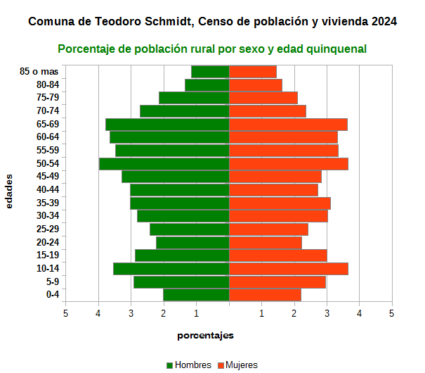 Gráfico con los porcentajes de la población rural de la comuna por sexo y edad quinquenal con datos del Censo de Población y Vivienda 2024.