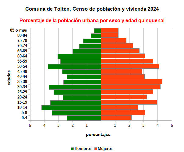 Gráfico con los porcentajes de la población urbana de la comuna por sexo y edad quinquenal con datos del Censo de Población y Vivienda 2024.