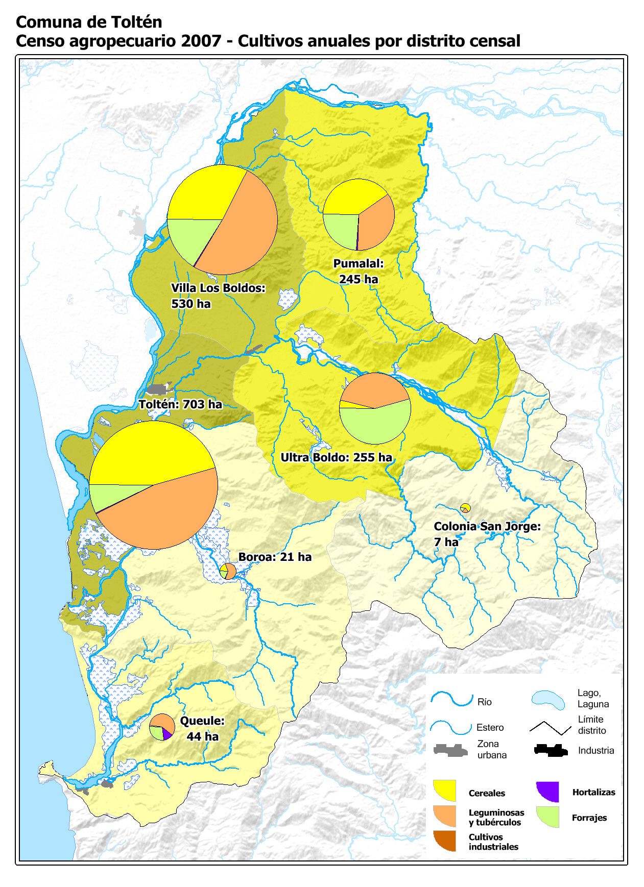 Los diferentes tipos de cultivos anuales por distrito censal de acuerdo información proporcionada por ODEPA.
