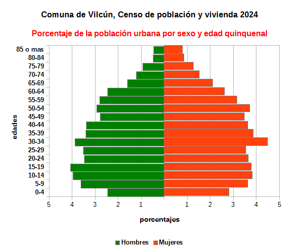 Gráfico con los porcentajes de la población urbana de la comuna por sexo y edad quinquenal con datos del Censo de Población y Vivienda 2024.