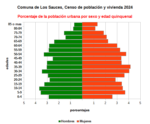 Gráfico con los porcentajes de la población urbana de la comuna por sexo y edad quinquenal con datos del Censo de Población y Vivienda 2024.