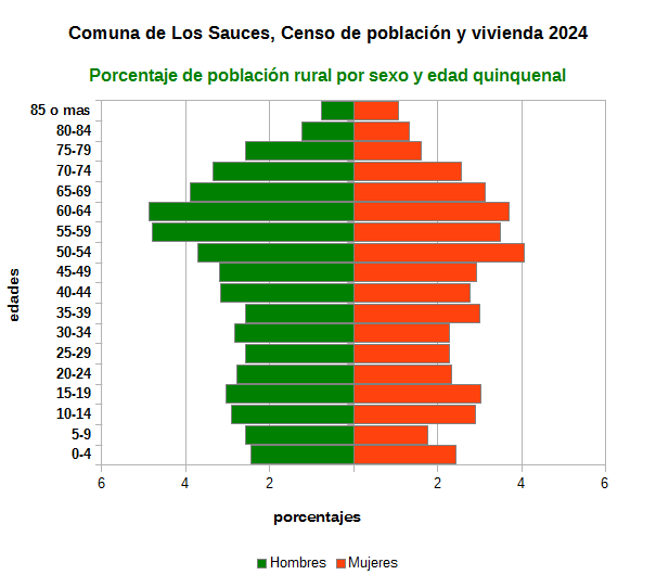 Gráfico con los porcentajes de la población rural de la comuna por sexo y edad quinquenal con datos del Censo de Población y Vivienda 2024.