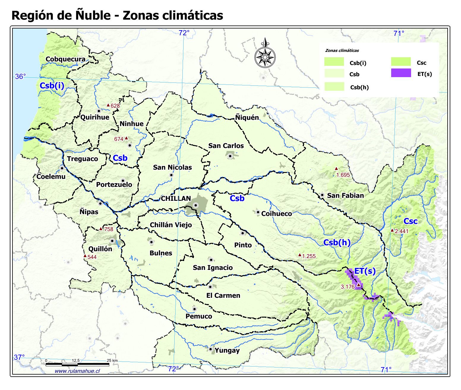 Mapa de las zonas climáticas confeccionada con una cobertura proporcionada por el Departamento de Geografía de la Universidad de Chile a través de la plataforma Geoportal de Chile. Consulta aquí la Leyenda para los mapas de las zonas climáticas.