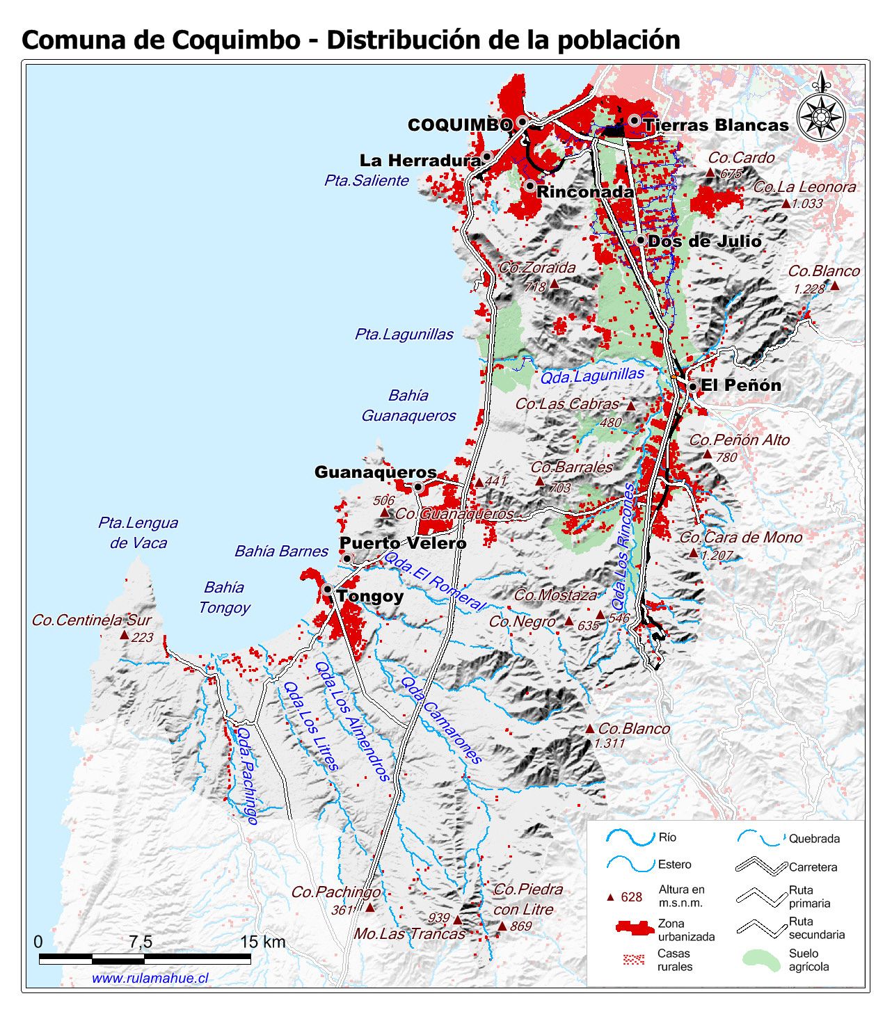 Mapa que muestra la ubicación y expansión de las zonas urbanas y la distribución de las casas rurales.