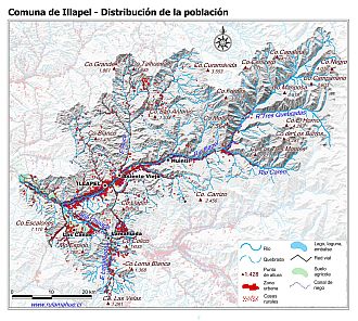 Mapa que muestra la ubicación y expansión de las zonas urbanas y la distribución de las casas rurales.