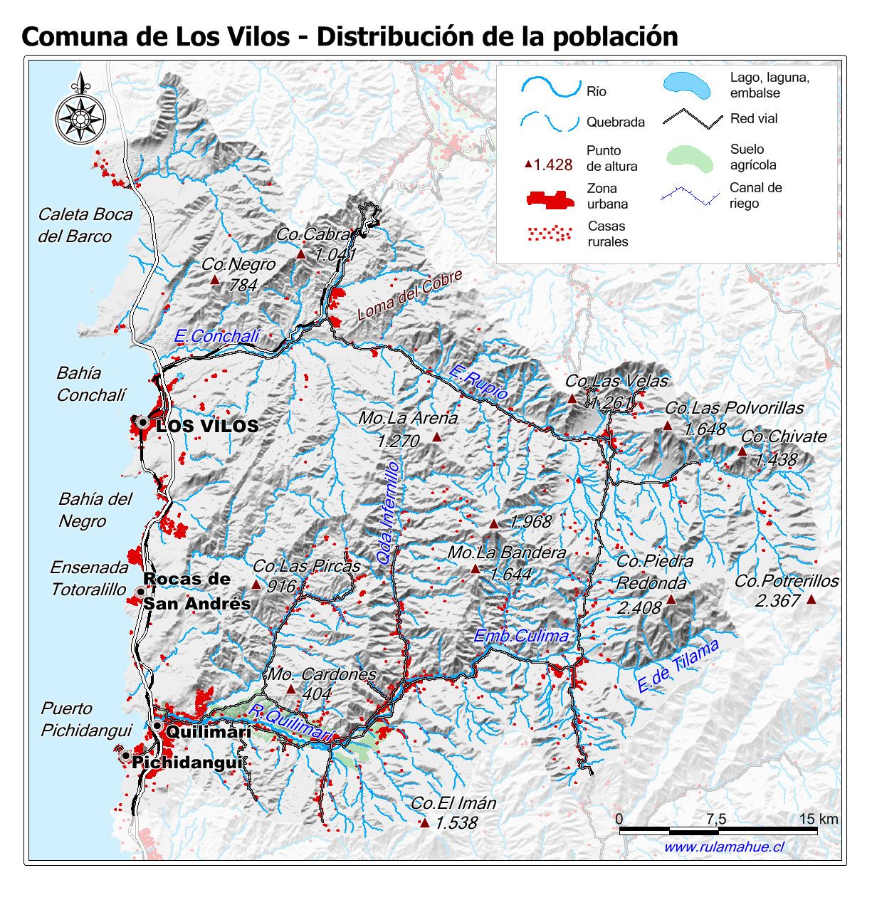 Mapa que muestra la ubicación y expansión de las zonas urbanas y la distribución de las casas rurales.