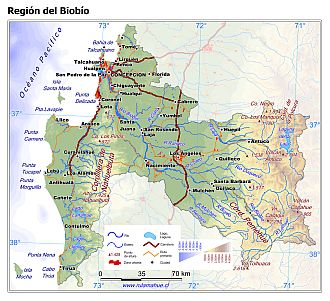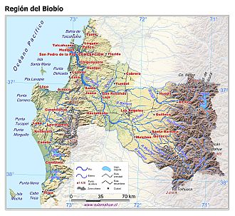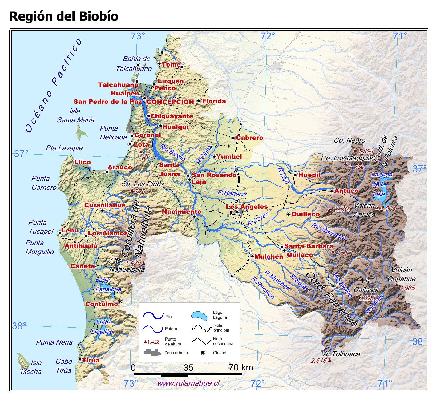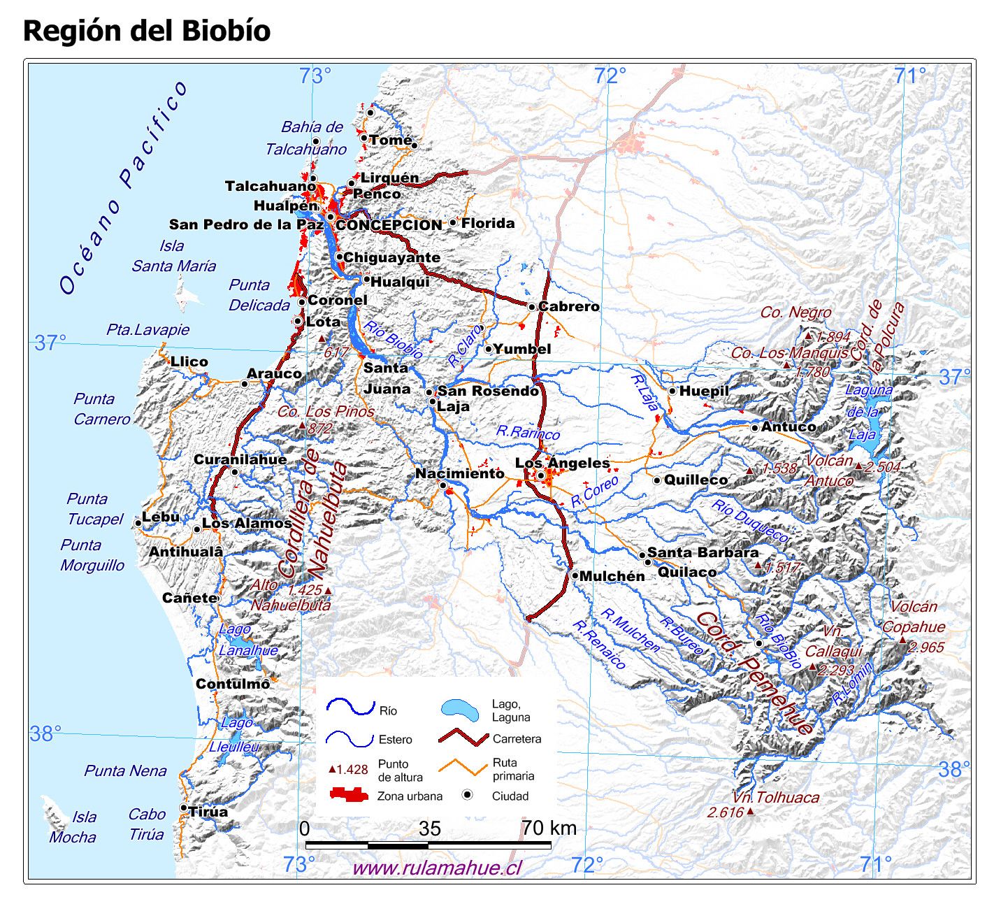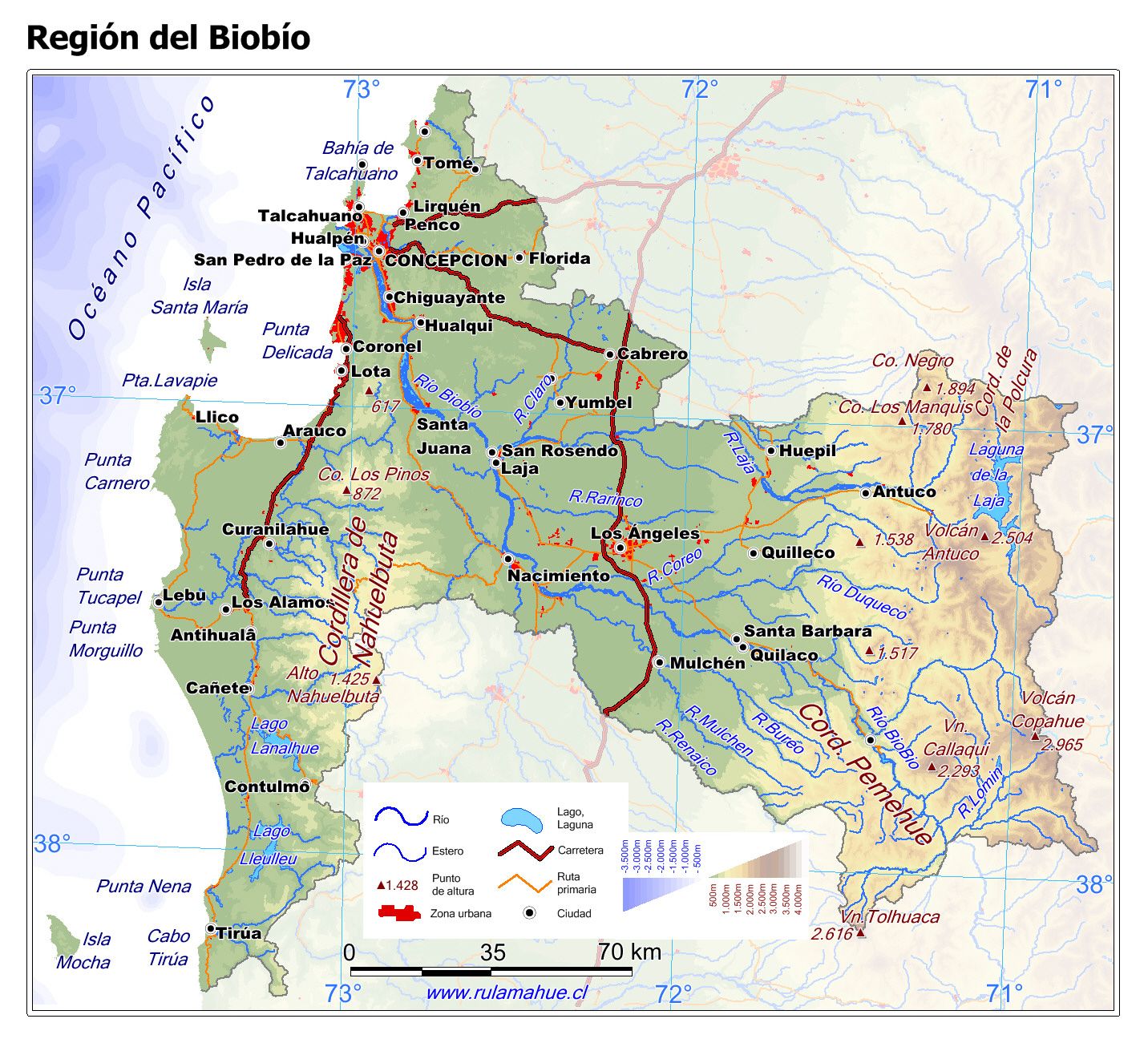 Mapa base de la Región con fondo de niveles de alturas coloreadas.