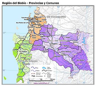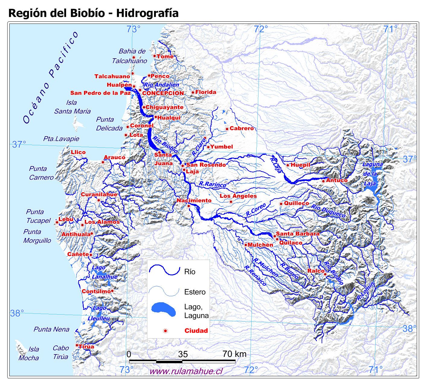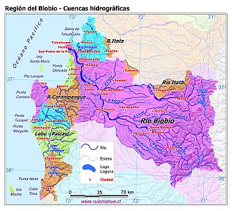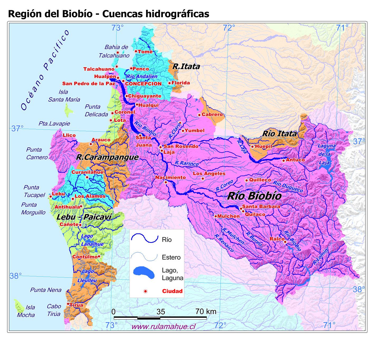 Mapa de las cuencas hidrográficas según información de la Dirección General de Aguas del Ministerio de Obras Públicas.