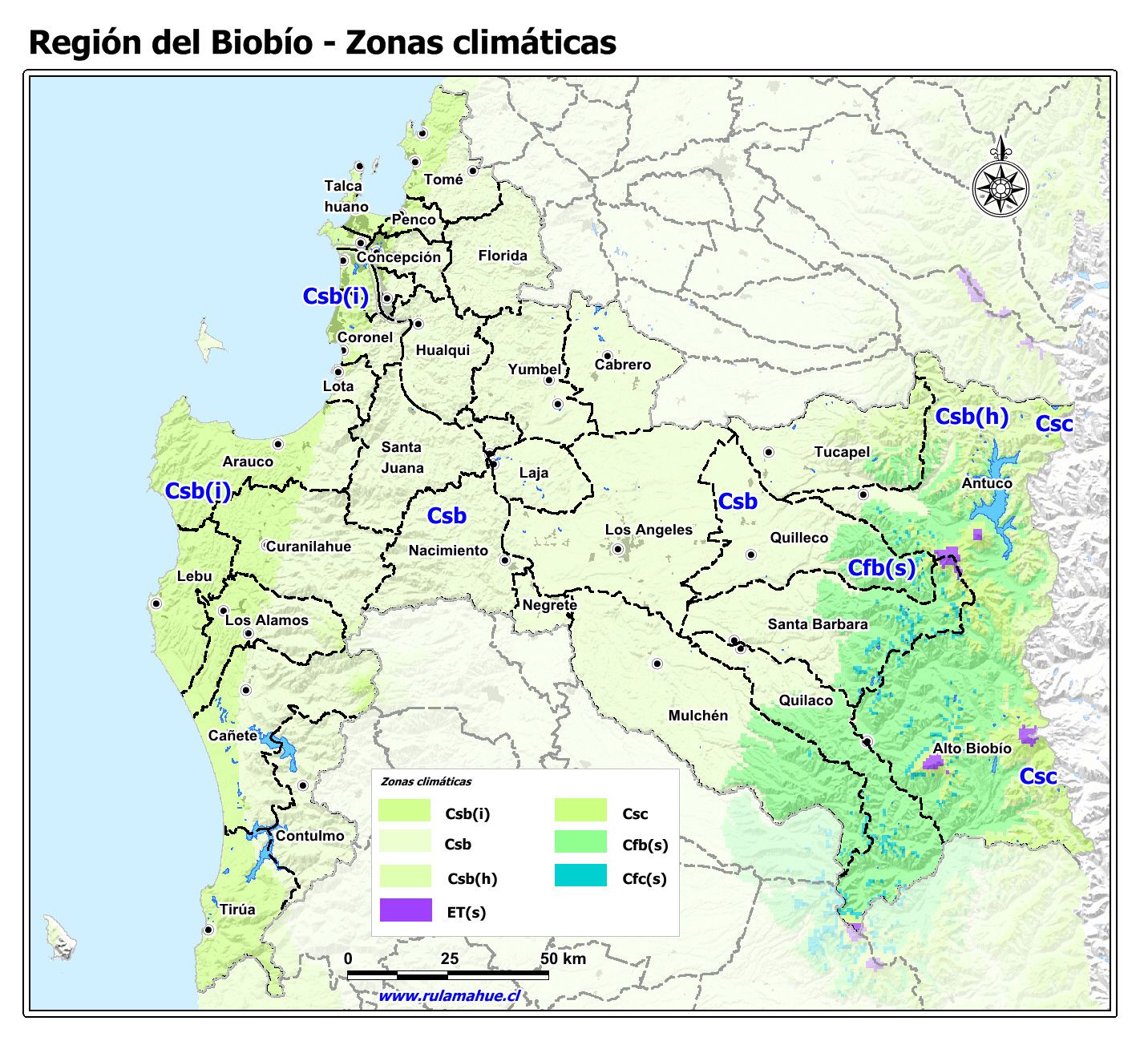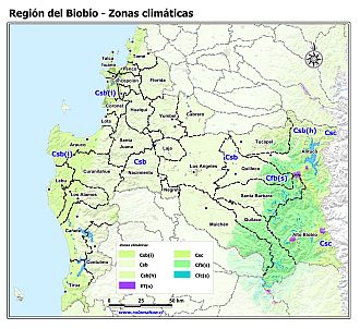 Mapa de las zonas climáticas confeccionada con una cobertura proporcionada por el Departamento de Geografía de la Universidad de Chile a través de la plataforma Geoportal de Chile. Consulta aquí la Leyenda para los mapas de las zonas climáticas.