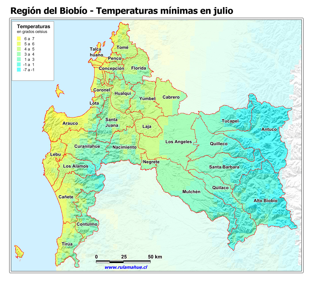 Mapa de la distribución de las temperaturas mínimas de julio.