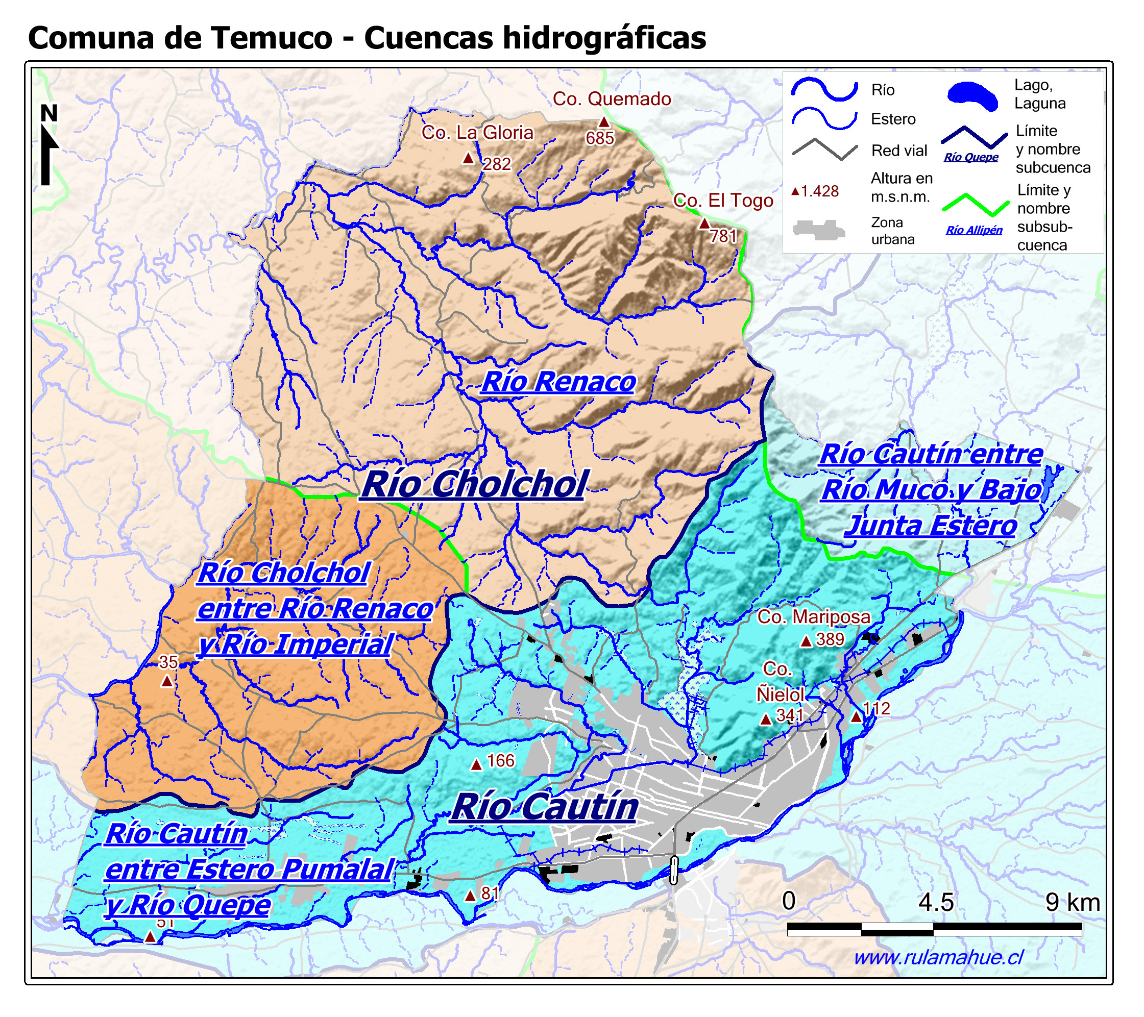 Mapa de las cuencas hidrográficas según información de la Dirección General de Aguas del Ministerio de Obras Públicas.