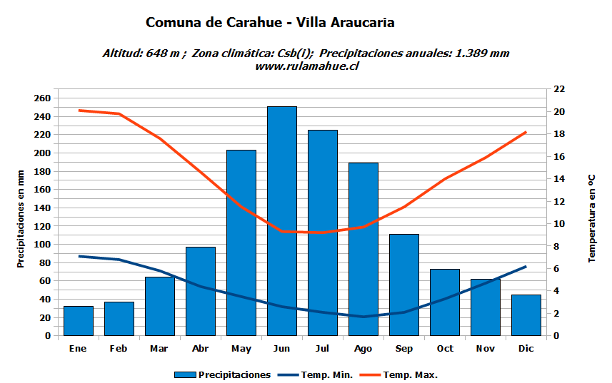 Climograma de Villa Araucaria en la comuna de Carahue con datos del sitio web Worldclim.
