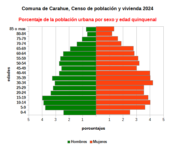 Gráfico con los porcentajes de la población urbana de la comuna por sexo y edad quinquenal con datos del Censo de Población y Vivienda 2024.