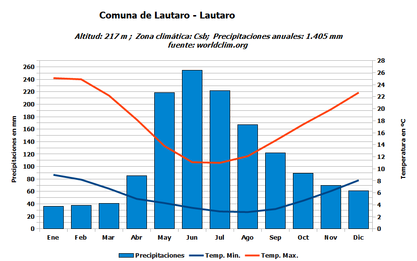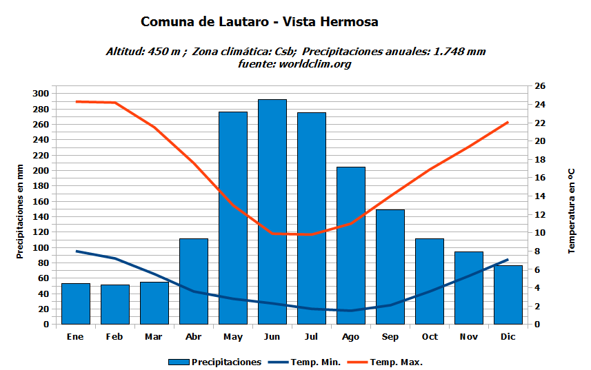 Climograma de Lautaro en la comuna de Lautaro con datos del sitio web Worldclim.