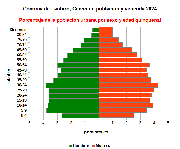 Gráfico con los porcentajes de la población urbana de la comuna por sexo y edad quinquenal