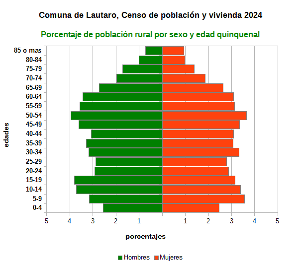 Gráfico con los porcentajes de la población rural de la comuna por sexo y edad quinquenal