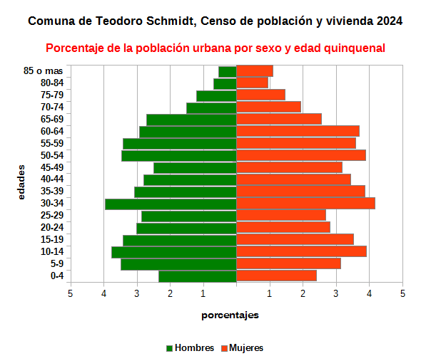 Gráfico con los porcentajes de la población urbana de la comuna por sexo y edad quinquenal con datos del Censo de Población y Vivienda 2024.