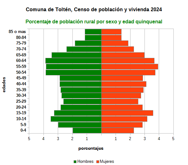 Gráfico con los porcentajes de la población rural de la comuna por sexo y edad quinquenal con datos del Censo de Población y Vivienda 2024.