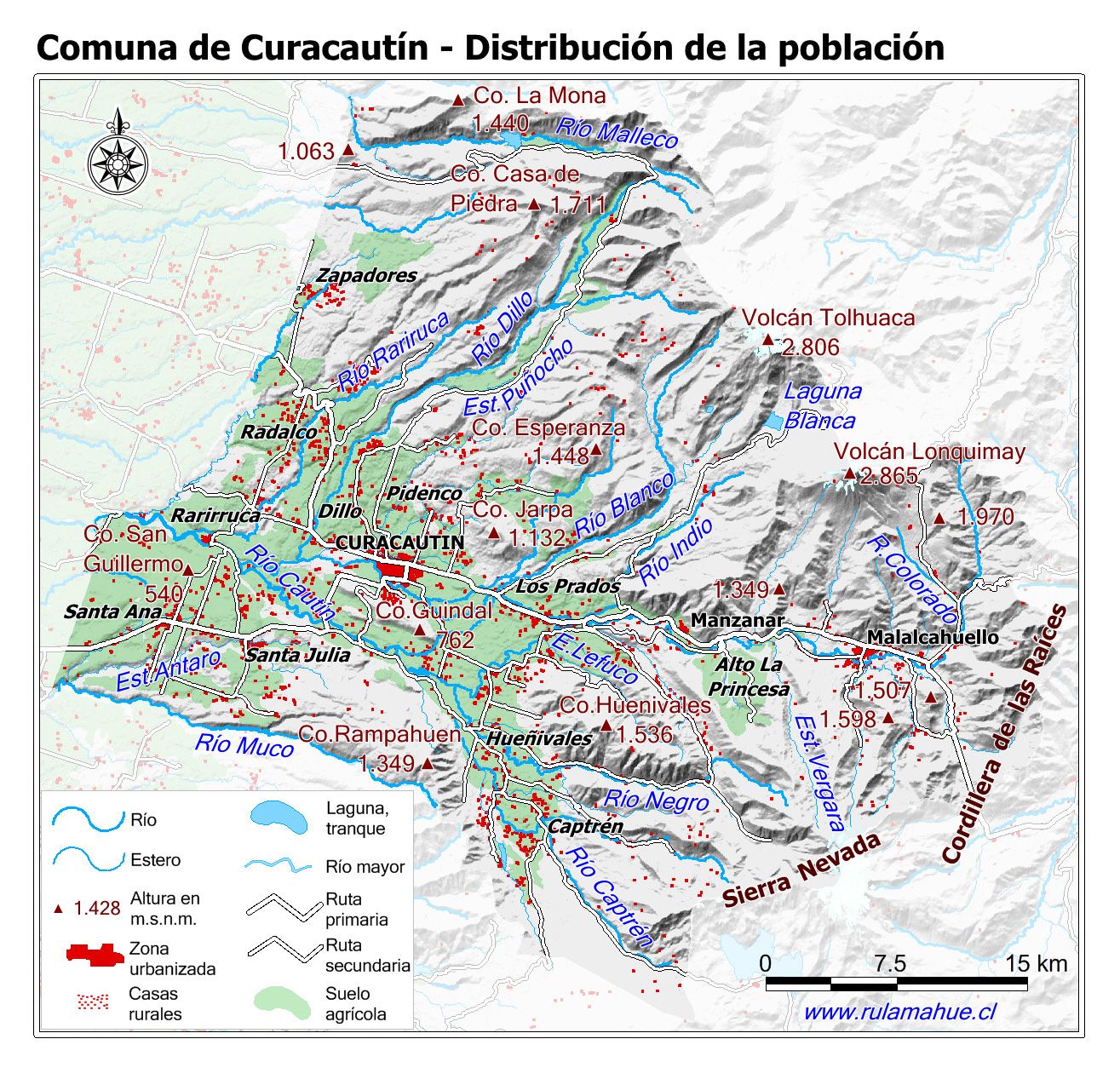 Mapa que muestra la ubicación y expansión de las zonas urbanas y la distribución de las casas rurales.
