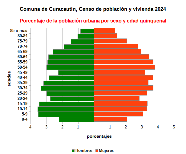 Gráfico con los porcentajes de la población urbana de la comuna por sexo y edad quinquenal con datos del Censo de Población y Vivienda 2024.