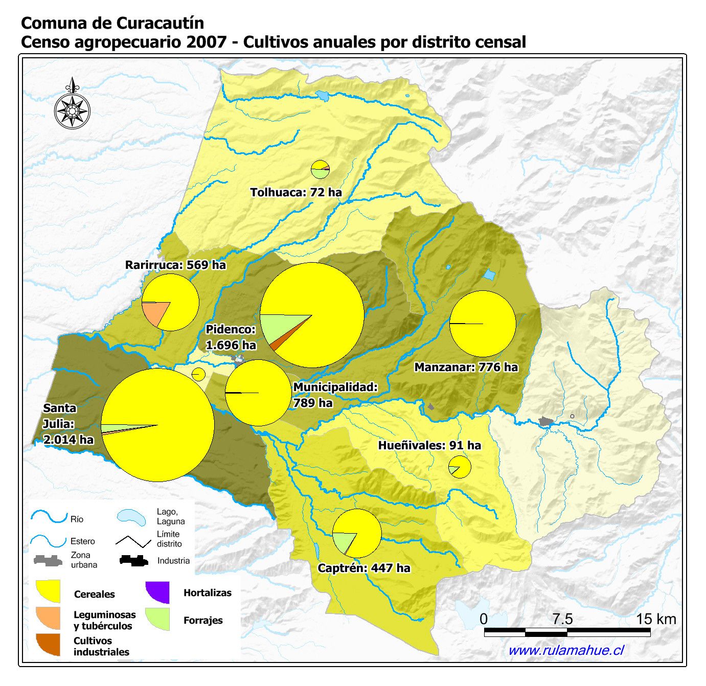Los diferentes tipos de cultivos anuales por distrito censal de acuerdo información proporcionada por ODEPA.