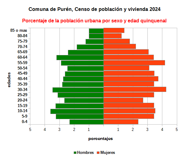 Gráfico con los porcentajes de la población urbana de la comuna por sexo y edad quinquenal con datos del Censo de Población y Vivienda 2024.