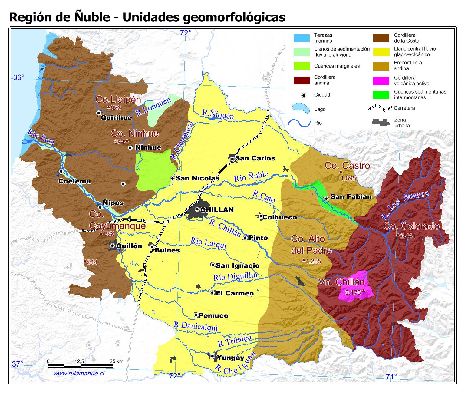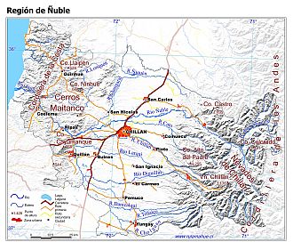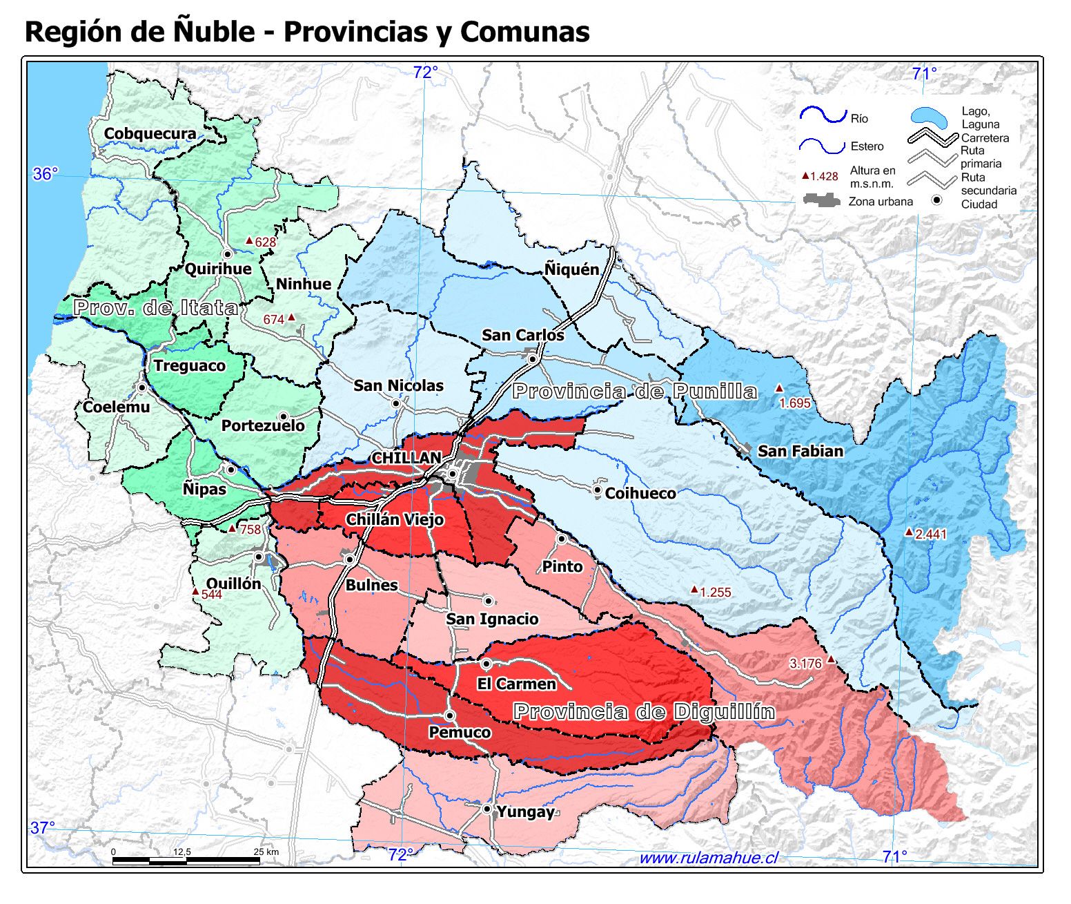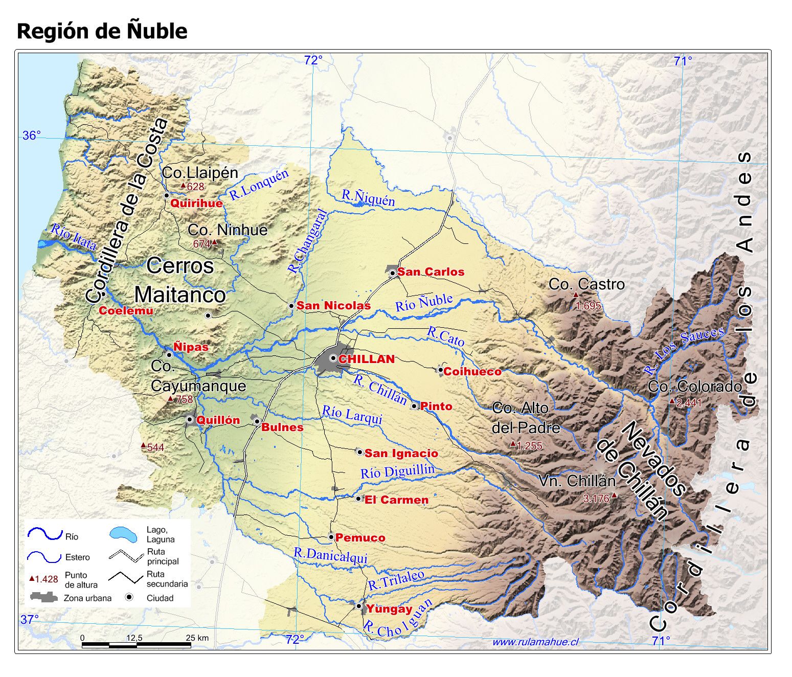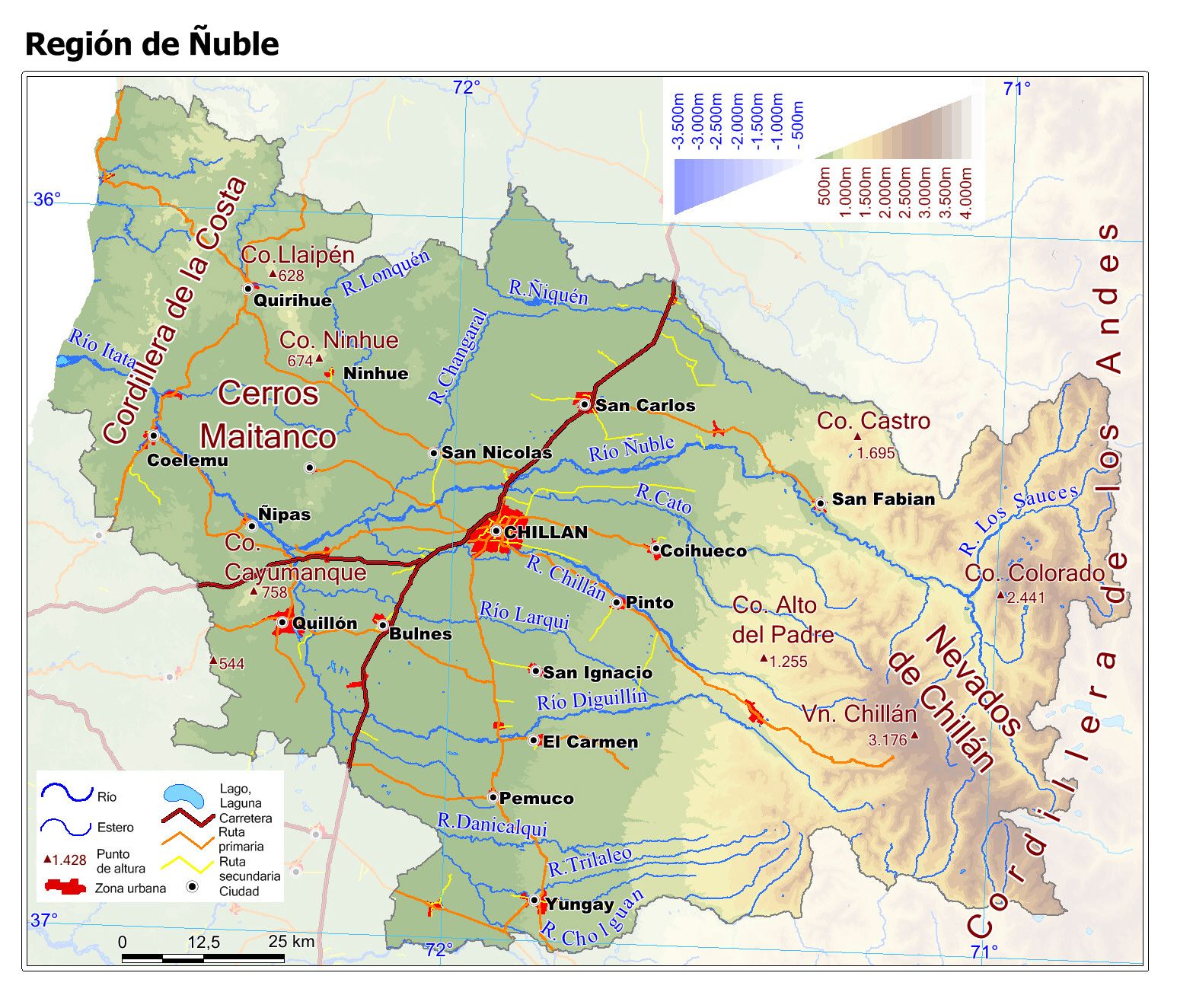 Mapa base de la Región con fondo de niveles de alturas coloreadas.
