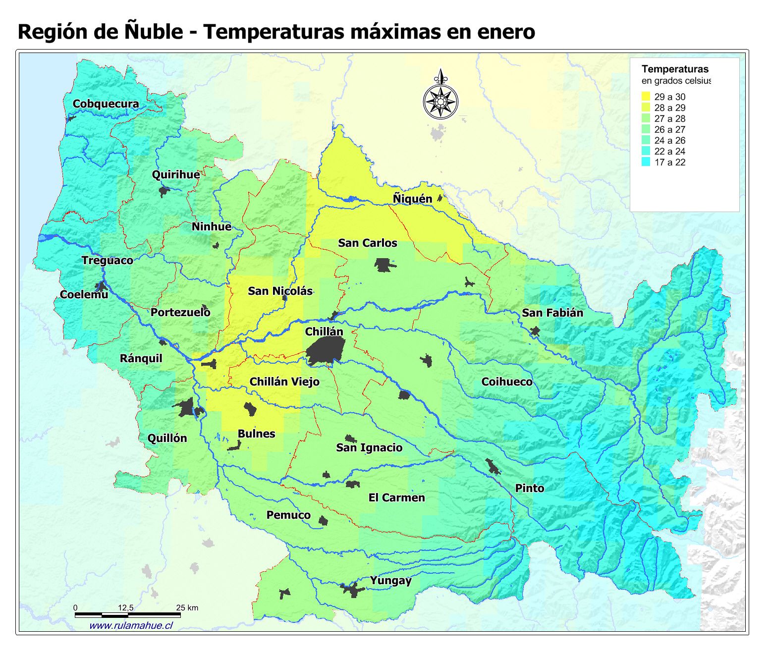 Mapa de la distribución de las temperaturas máximas de enero con datos del sitio web Worldclim.