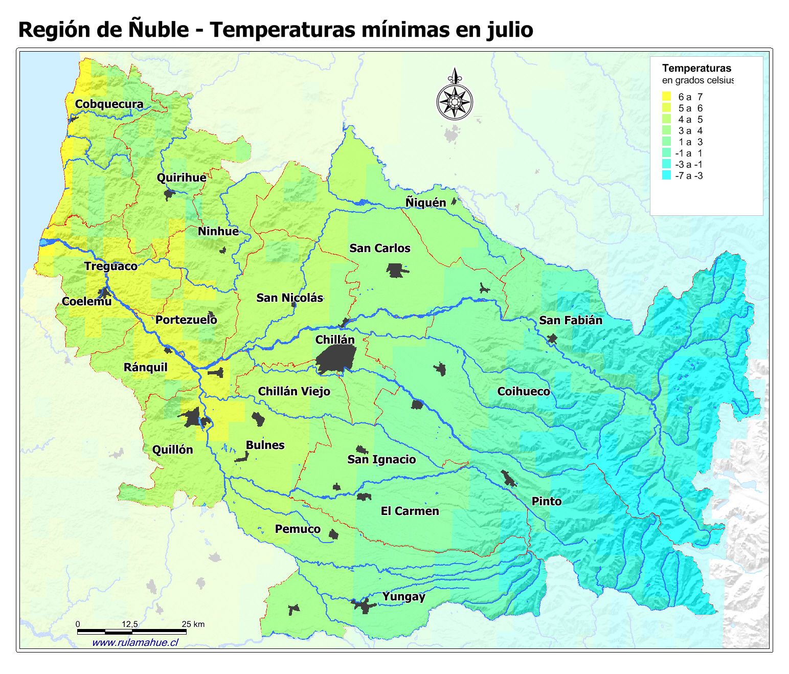 Mapa de la distribución de las temperaturas mínimas de julio con datos del sitio web Worldclim.