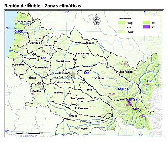 Mapa de las zonas climáticas confeccionada con una cobertura proporcionada por el Departamento de Geografía de la Universidad de Chile a través de la plataforma Geoportal de Chile. Consulta aquí la Leyenda para los mapas de las zonas climáticas.