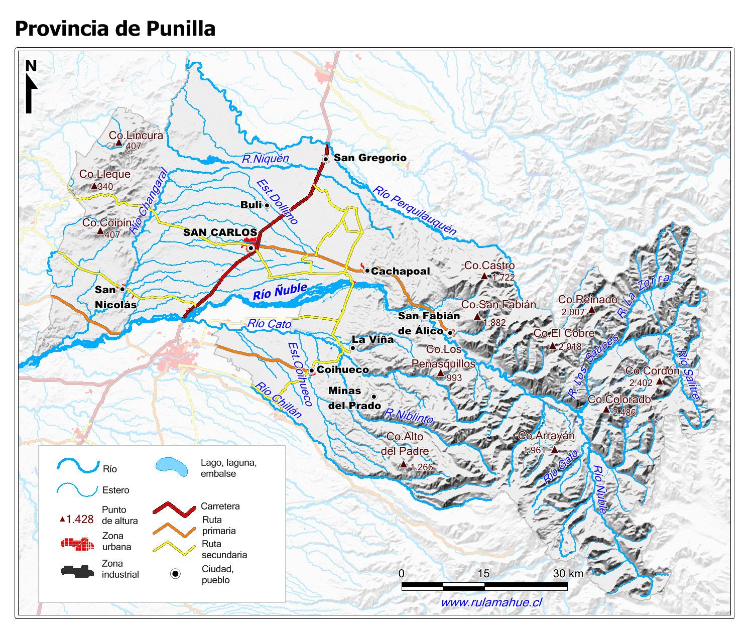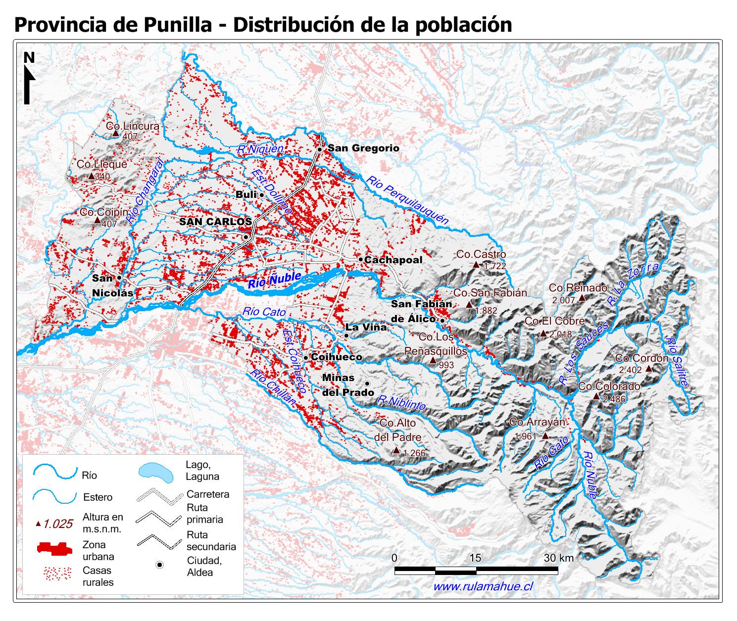 Mapa que muestra la ubicación de las zonas urbanas y la distribución de las casas rurales.